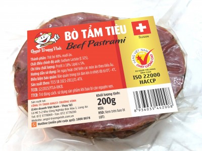 Thành phần: Thịt bò 90%, muối ănHạn sử dụng: 40 ngày.Điều kiện bảo quản: Trong túi dán kín ở nhiệt độ 0-4°C (ngăn mát tủ lạnh).Cách dùng : Ăn ngay hoặc chế biến các món ăn theo kiểu ÂuQuy cách: 200gr-1kg/túi.