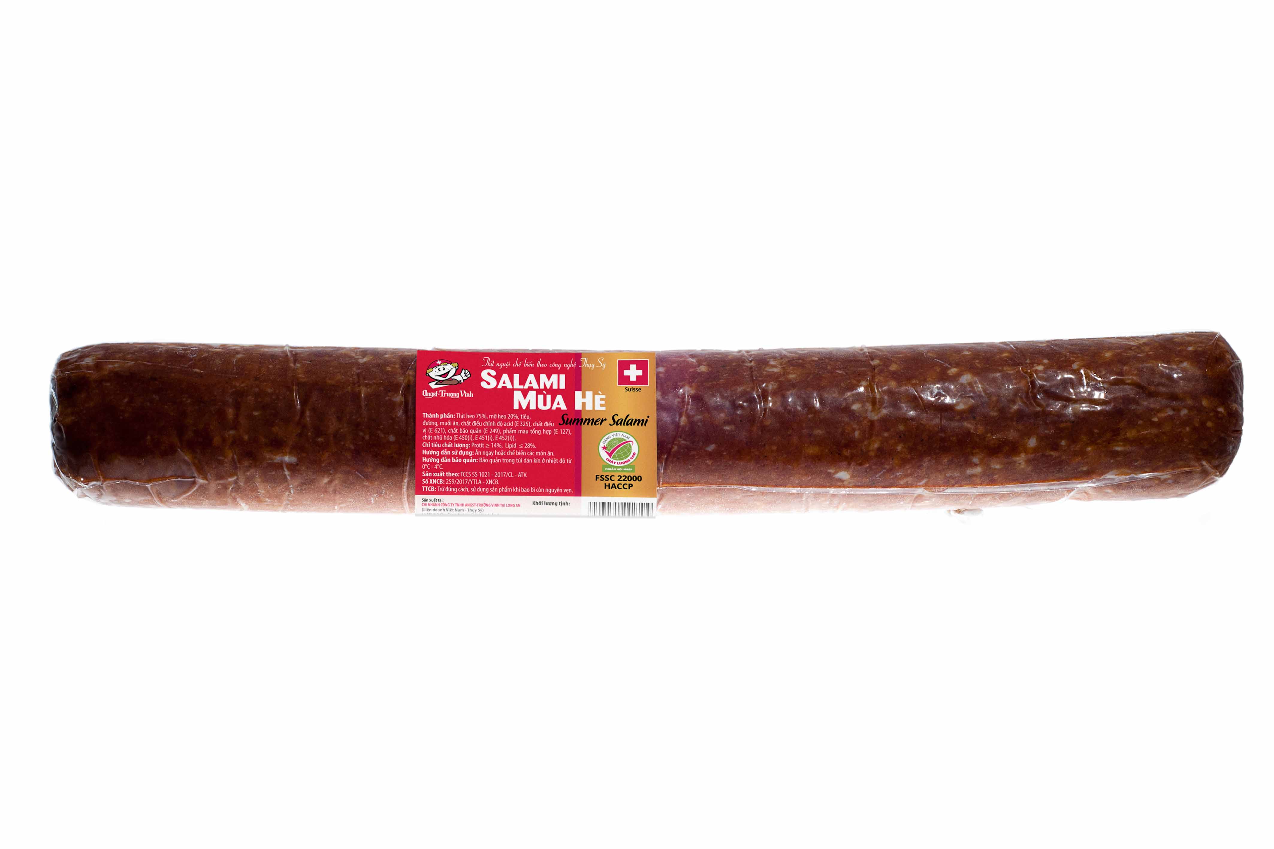 _ Thành phần: Thịt heo, thịt bò, gia vị._ Hạn sử dụng: 40 ngày._ Điều kiện bảo quản: Trong túi dán kín ở nhiệt độ 0-4°C (ngăn mát tủ lạnh)._ Đặc điểm: Sản xuất từ nguồn nguyên liệu được chọn lọc kỹ, ướp gia vị và xông khói bằng dăm gỗ sồi thiên nhiên nhập […]